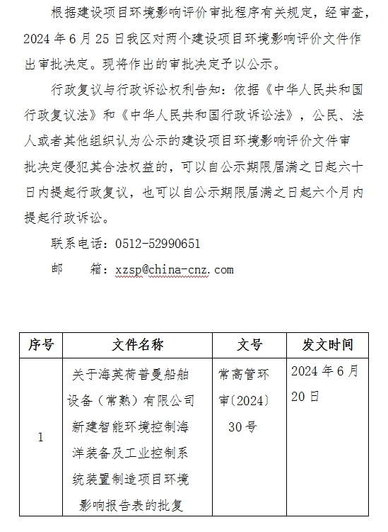 2024年6月25日常熟高新技術(shù)產(chǎn)業(yè)開發(fā)區(qū)關(guān)于作出建設(shè)項(xiàng)目環(huán)境影響評(píng)價(jià)的決定